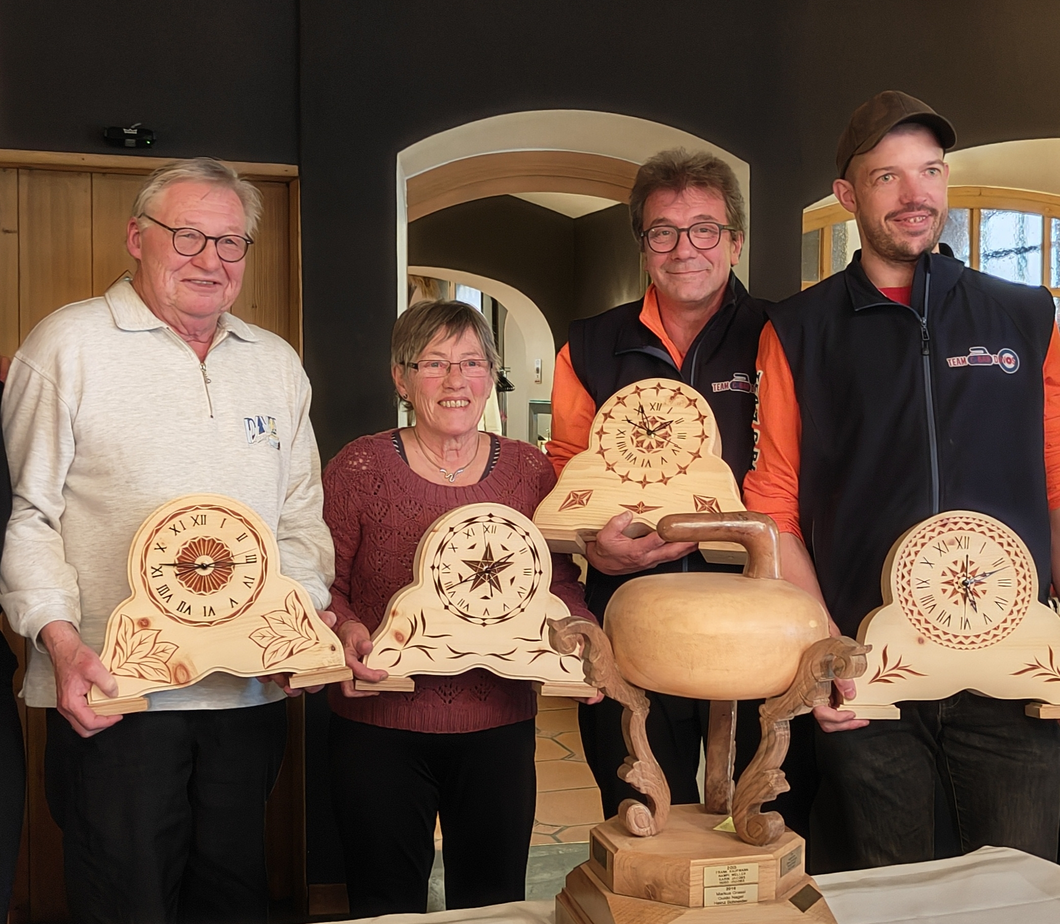 Sechs Davoser Teams kämpften um den Titel Clubmeister 2024. Voraussetzung ist, dass alle vier Mitspieler Mitglied des CC Davos sind. Hart umkämpft waren die Spiele gegen teils einheimische aber auch gegen die starken auswärtigen Teams. Gut gespielt und verdienter Clubmeister wurde das C-Bar Team mit Gian Reto Cantieni, Harry Tschanz und Adi Rykens. Den zweiten Platz sicherten sich unsere jungen Wilden und letztjähriger Clubmeister Team Young Guns mit Daniel Jussel, Urs und Chrischi Matthey und Dominic Russi. Den dritten Platz belegte das Dreierteam mit Willi Wyrsch, Heinz Schneider und Peter Lang. Wie jedes Jahr hat unser Mitglied Walter Stoller die wunderschönen geschnitzten Holzsachen in Handarbeit angefertigt und als Preise für die ersten drei gesponsert. Ganz herzlichen Dank an Stölle. Wie immer durften wir die Gastfreundschaft im Hotel Parsenn mit einem feinen Essen geniessen und weiter im Gada weiterfeiern. Auch an dieser Stelle ein Danke an Hans Fopp.
